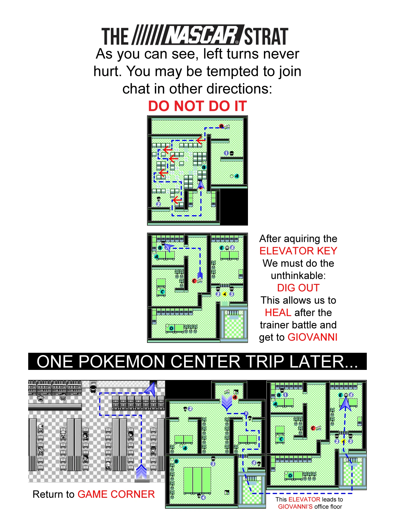 The Nascar Strat was a plan to successfully move through the Rocket Hideout to acquire the Elevator Key and then battle Giovanni. This plan was semi-successful but it took the help of a new feature called Democracy to get it done.